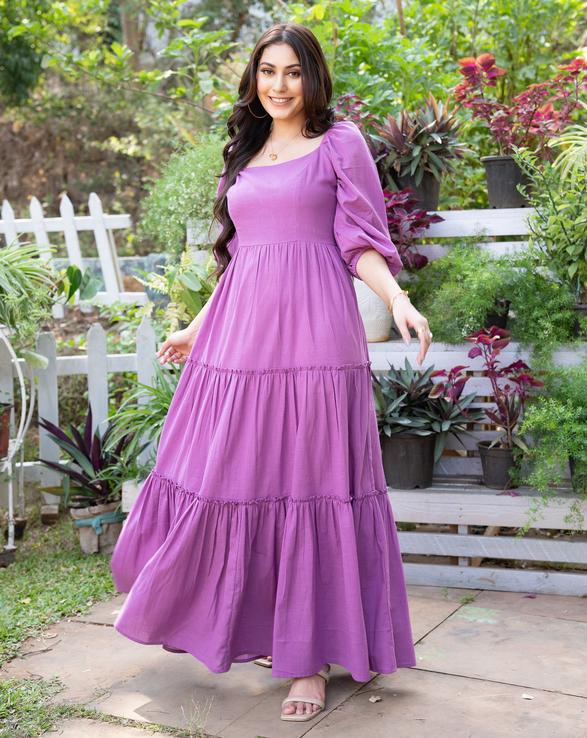 This long dress is carefully crafted to exude grace and glamour. Utilizing high-quality cotton, the dress offers a soft and comfortable fit. The addition of elastic in the sleeves creates a dramatic, balloon-like effect. Elevate your wardrobe with this timeless and adaptable maxi dress.